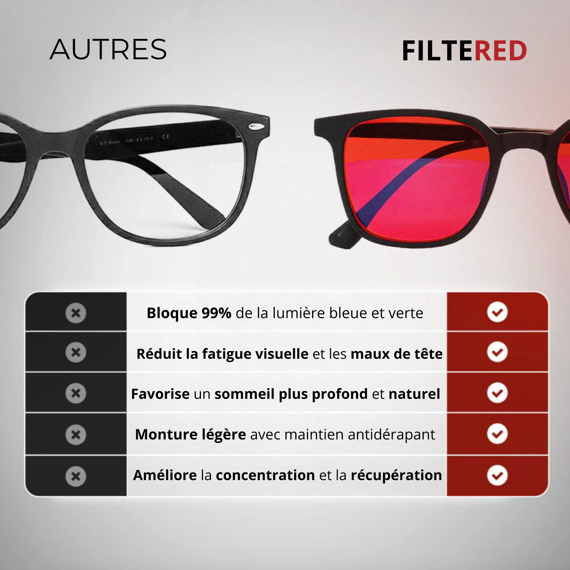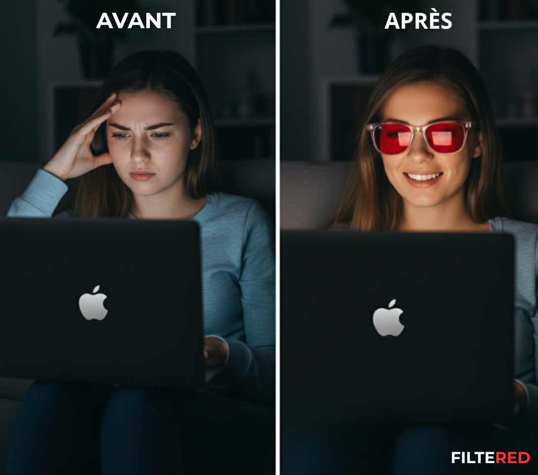 Protégez vos yeux et améliorez votre sommeil naturellement avec nos lunettes anti-lumière bleue à verres rouges.