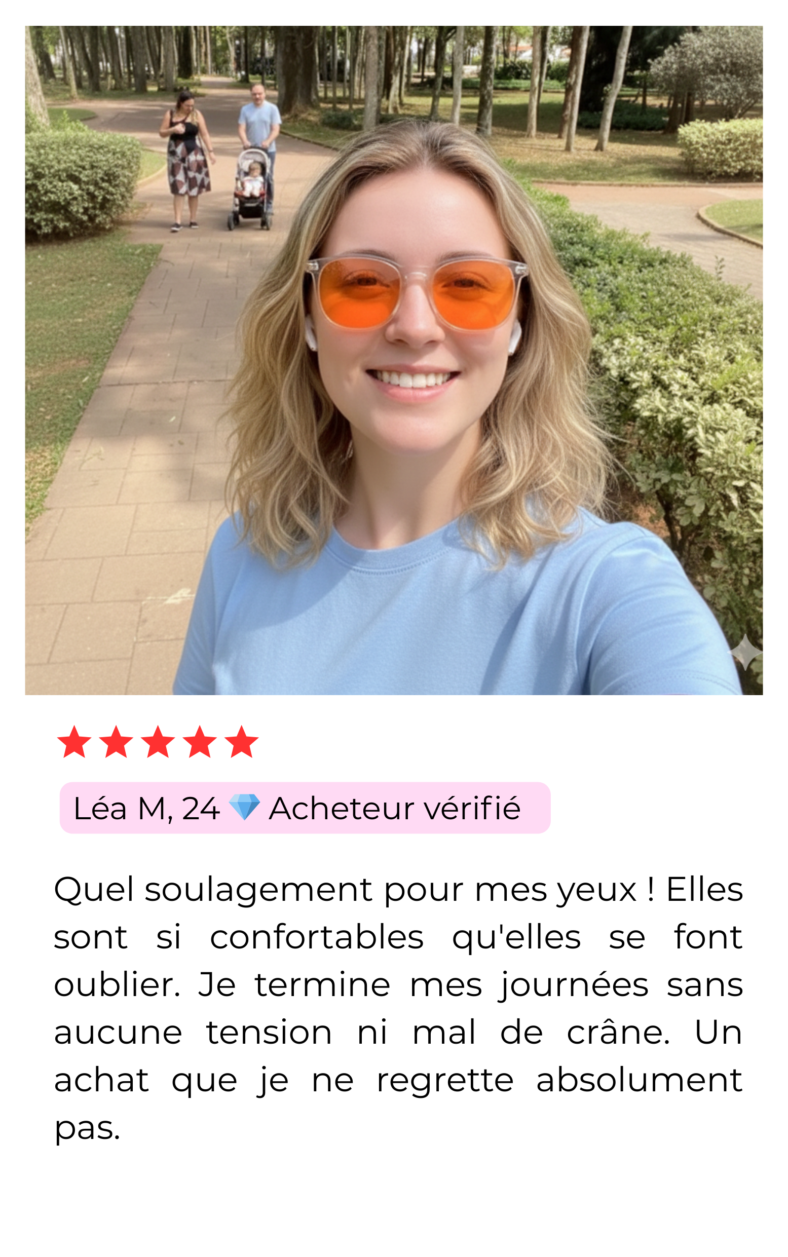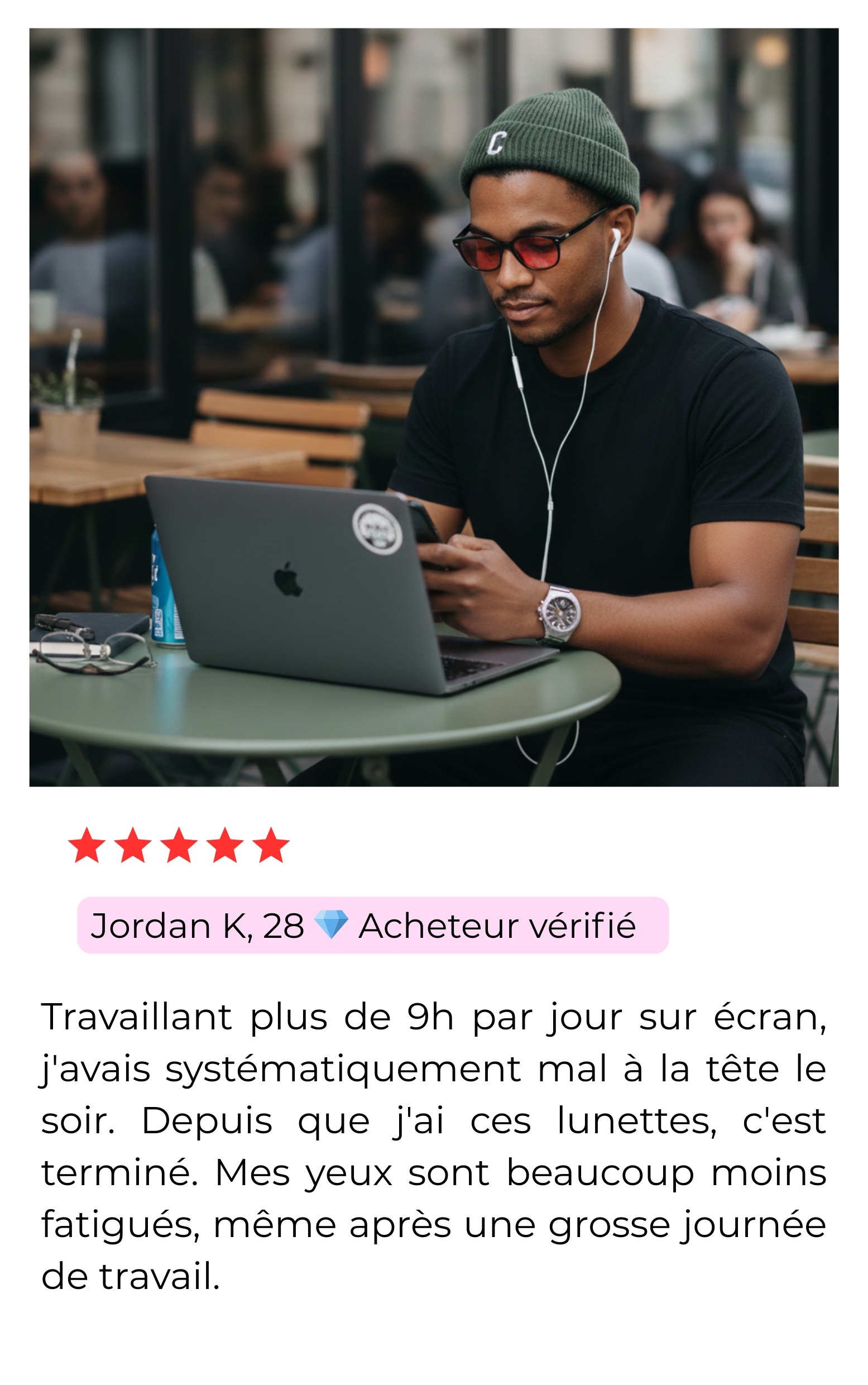 Ces lunettes sont confortables pour être portées toute la journée, surtout si vous êtes exposé(e) aux écrans ou aux lumières artificielles. Leur conception légère et antidérapante assure un confort pendant une utilisation prolongée.