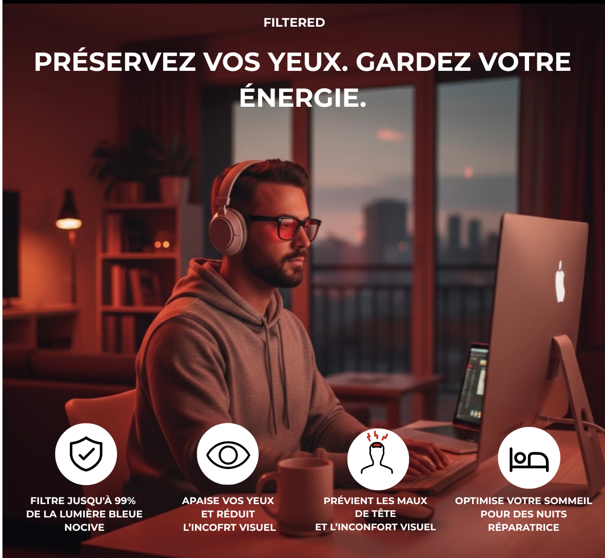 Les filtres à lentilles rouges bloquent la lumière à courte longueur d'onde émise par vos appareils, réduisant ainsi la fatigue, favorisant un sommeil plus profond et maintenant votre énergie.